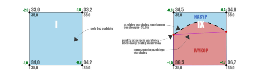 Kwadraty w siatce, przez które przebiega warstwica z poziomem docelowym – 35,0m(przerywana linia), dzielimy na mniejsze figury zgodnie z punktami przecięcia(czerwone punkty na schemacie). Jak widać na schemacie, aby uprościć powstałe figury przeprowadzamy linię łączącą punkty przecięcia(fioletowa linia), po to, aby łatwiej było wyliczać pola powierzchni tych figur. Warstwica 35,0m przebiega w sposób łagodny w terenie, jednak my upraszczamy jej przebieg.