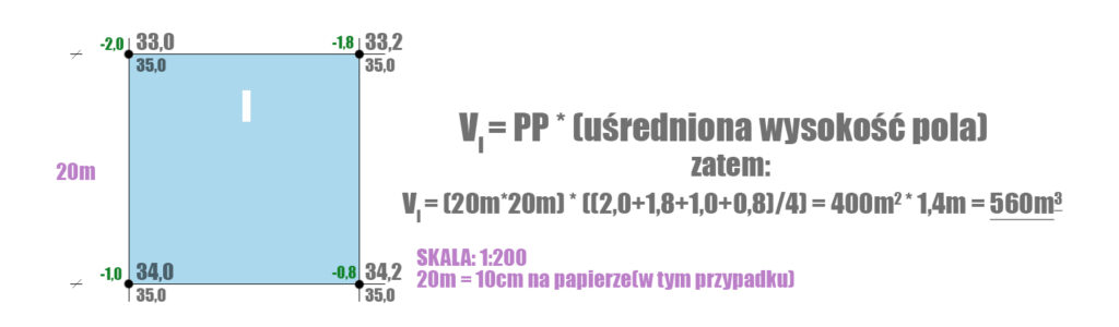 Aby obliczyć objętość mas ziemnych danego pola siatki kwadratów należy obliczyć pole powierzchni danej figury(w tym przypadku kwadratu), uśrednić wysokość danego pola, a następnie pomnożyć przez siebie obie uzyskane liczby. Wysokość pola uśrednimy dodając do siebie różnice wysokości wszystkich narożników i dzieląc wynik przez liczbę tych narożników. W tym przypadku mamy cztery narożniki. Pole jest kwadratem, zatem używamy wzoru na pole powierzchni kwadratu – a*b.