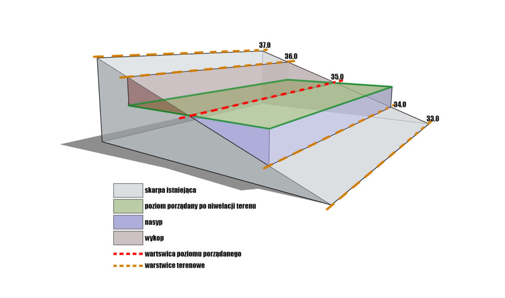 Na schemacie powyżej widzimy skarpę z zaznaczoną płaszczyzną(kolor zielony), którą chcemy uzyskać. W tym celu grunt powyżej tego poziomu należy wybrać – WYKOP(kolor różowy), a teren poniżej uzupełnić ziemią – NASYP(kolor niebieski). Skarpa w pewnym miejscu posiada już poziom docelowy, dlatego to miejsce stanowić będzie warstwicę ZERO(czerwona przerywana linia). Poziom tej warstwicy na schemacie oznaczono jako 35,0 m.n.p.m.