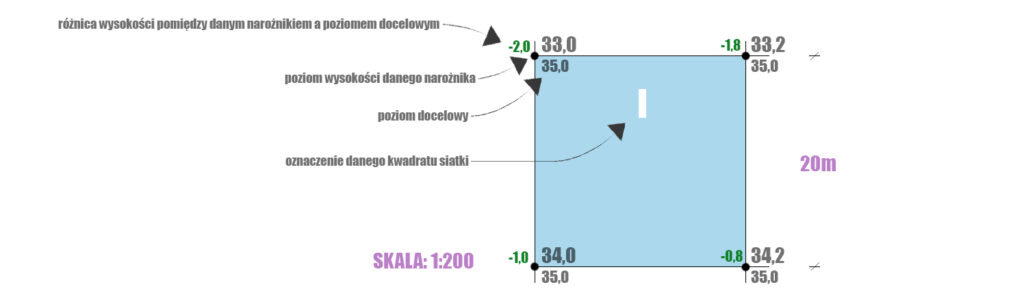 W każdym narożniku siatki kwadratów zapisujemy trzy wartości: istniejący poziom danego narożnika(największa liczba u góry), poziom docelowy terenu jaki chcemy uzyskać po niwelacji(w tym przypadku liczba 35,0), oraz różnicę wysokości pomiędzy dwoma poziomami(zielona liczba po lewej stronie). Oznaczamy również każdy kwadrat siatki następującą po sobie liczbą rzymską, co ułatwi orientację podczas dokonywania obliczeń.
