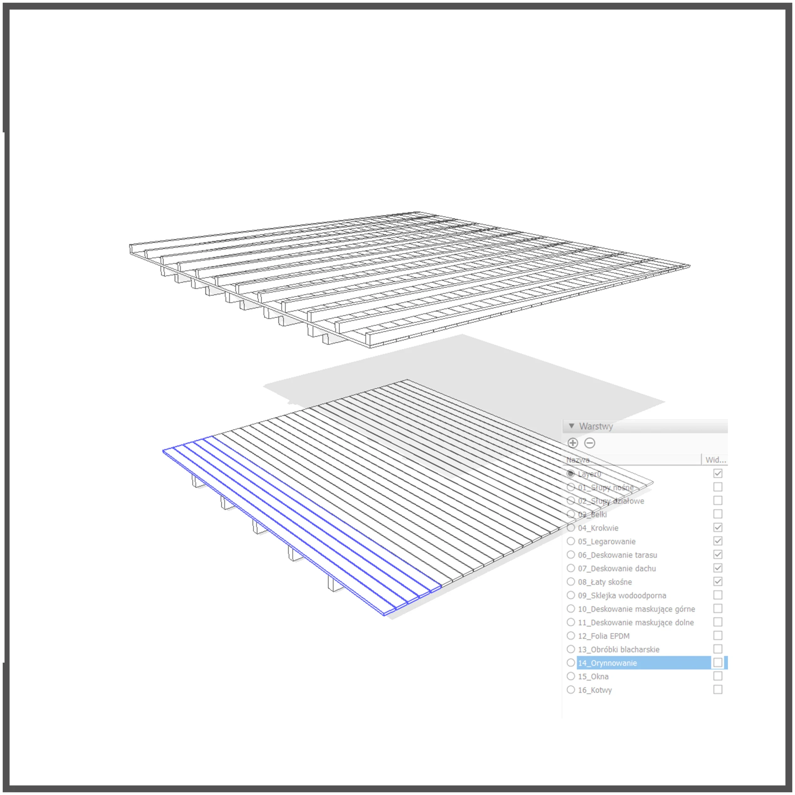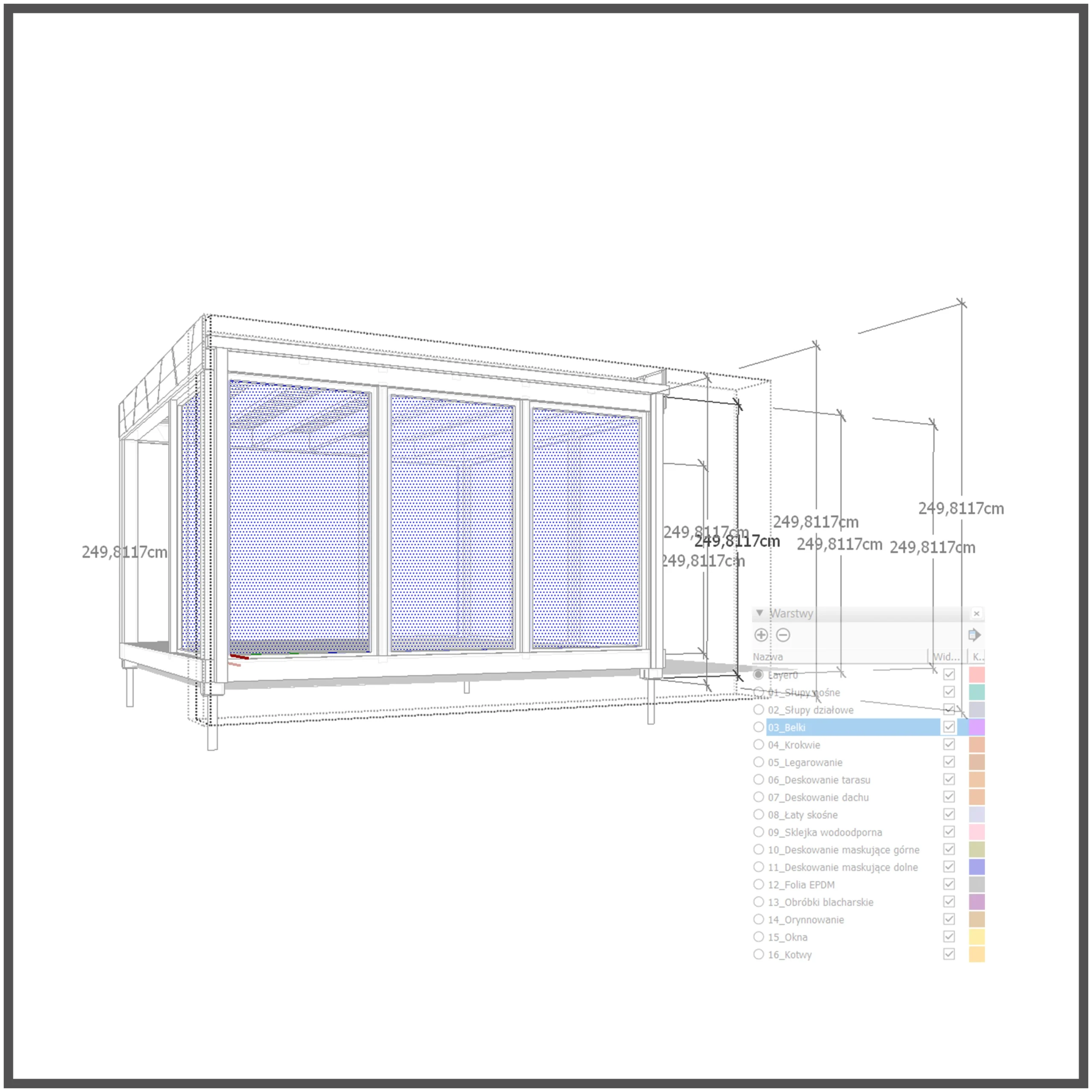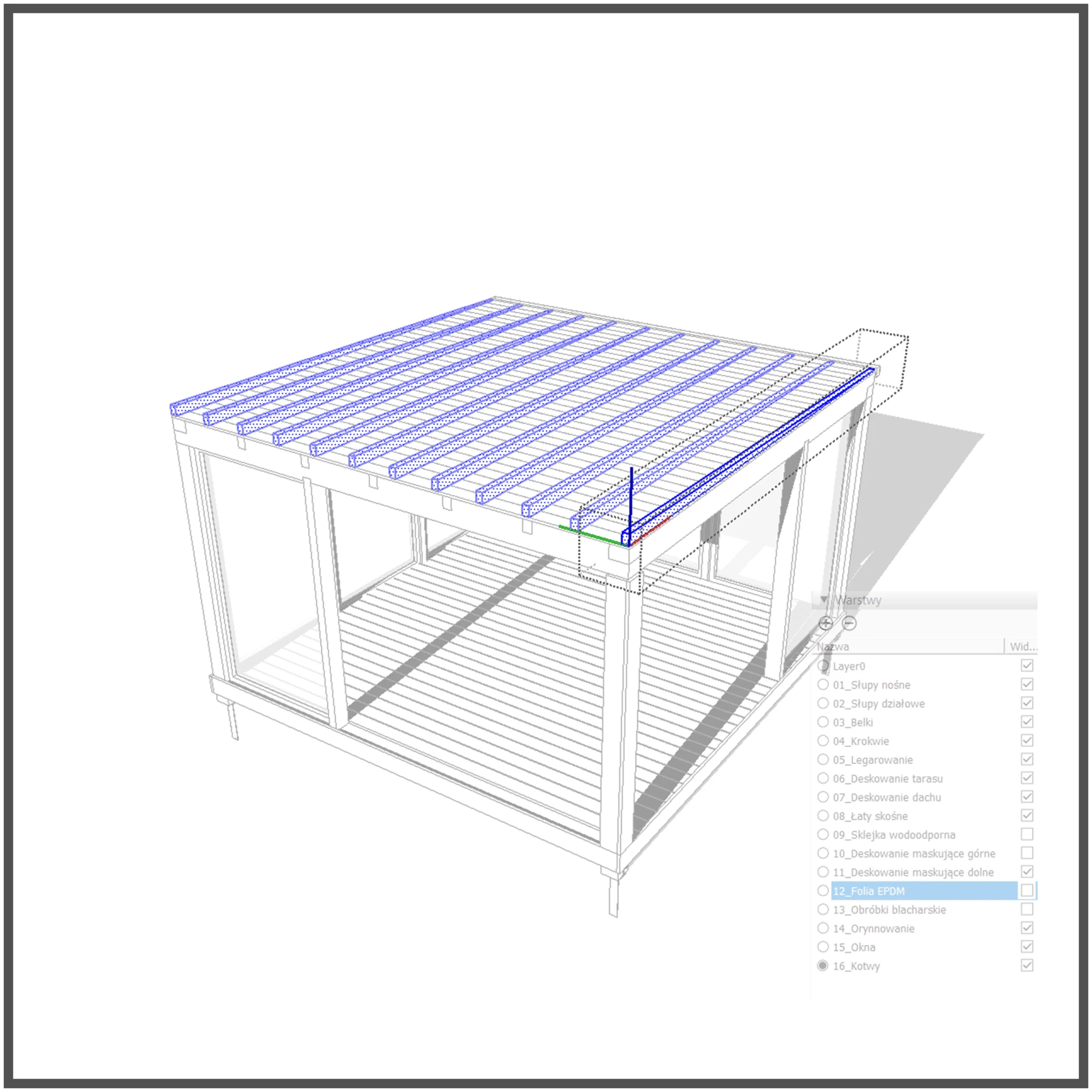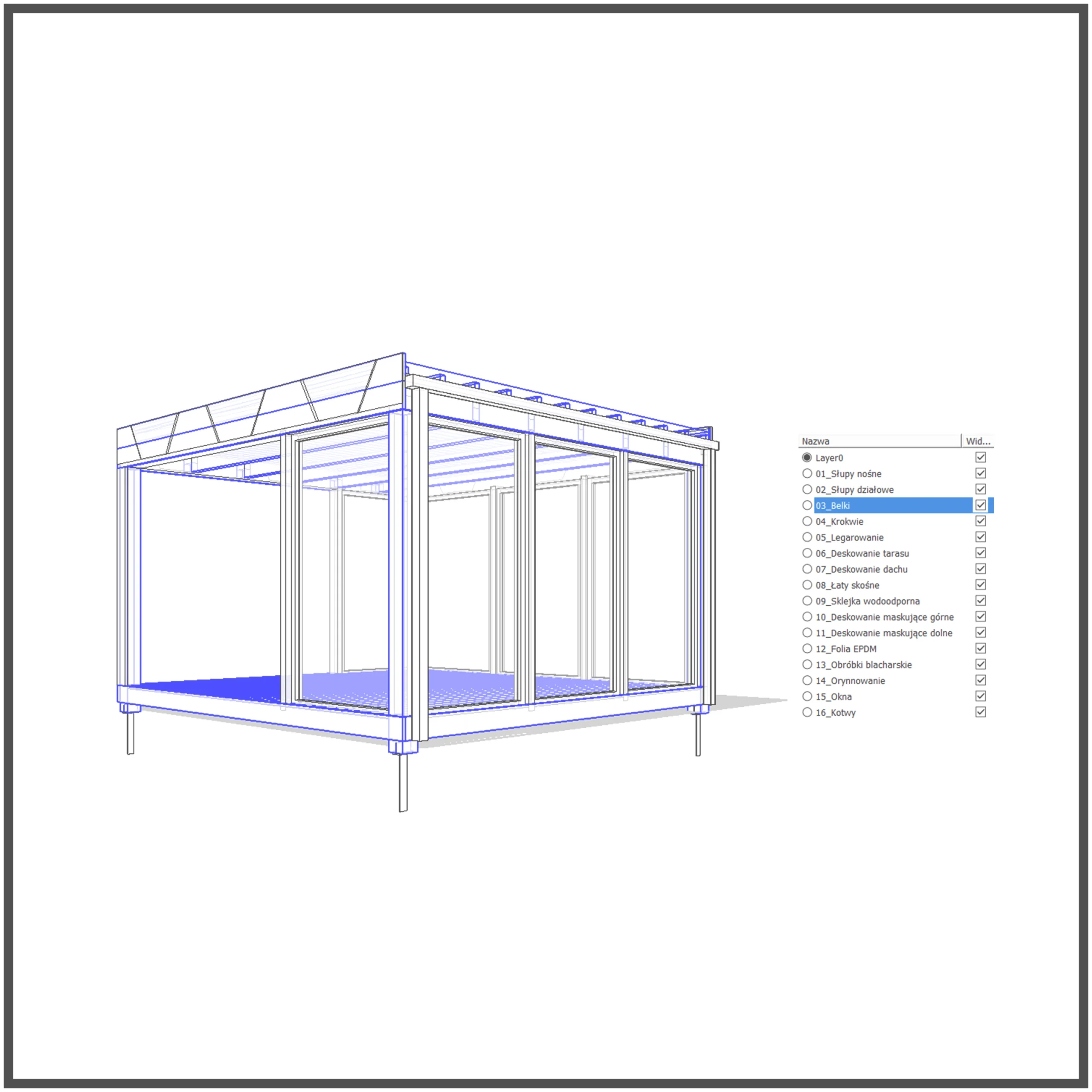 Każdy element przypisany do osobnej warstwy, dzięki czemu zyskujesz pełną kontrolę nad widocznością poszczególnych komponentów (słupy, dach, podłoga itp.).