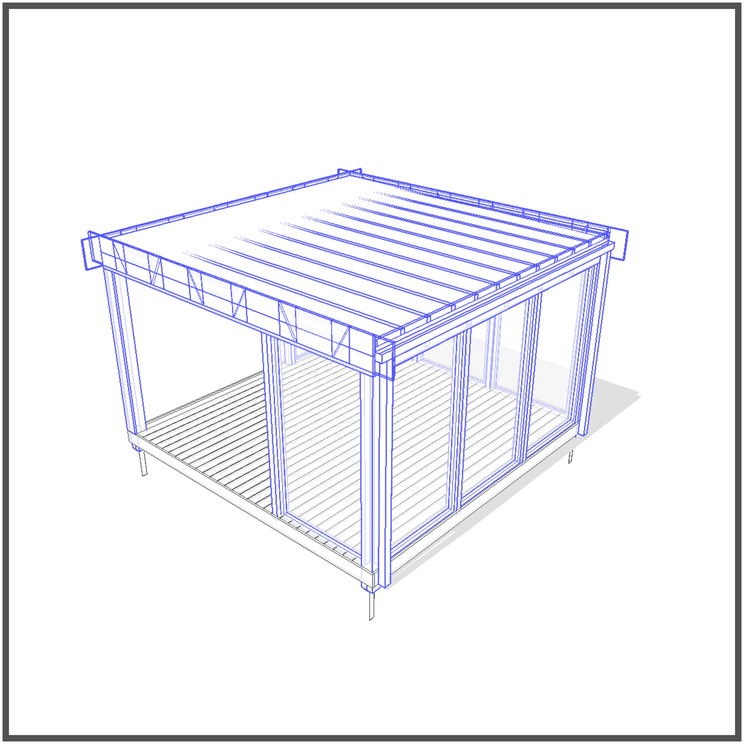 To trójwymiarowy model altany ogrodowej, przygotowany z myślą o użytkownikach SketchUp oraz innych aplikacji obsługujących format SKP. Konstrukcja została zaprojektowana jako wolnostojąca, z prostą i nowoczesną formą, co nadaje jej elegancki, współczesny charakter.
