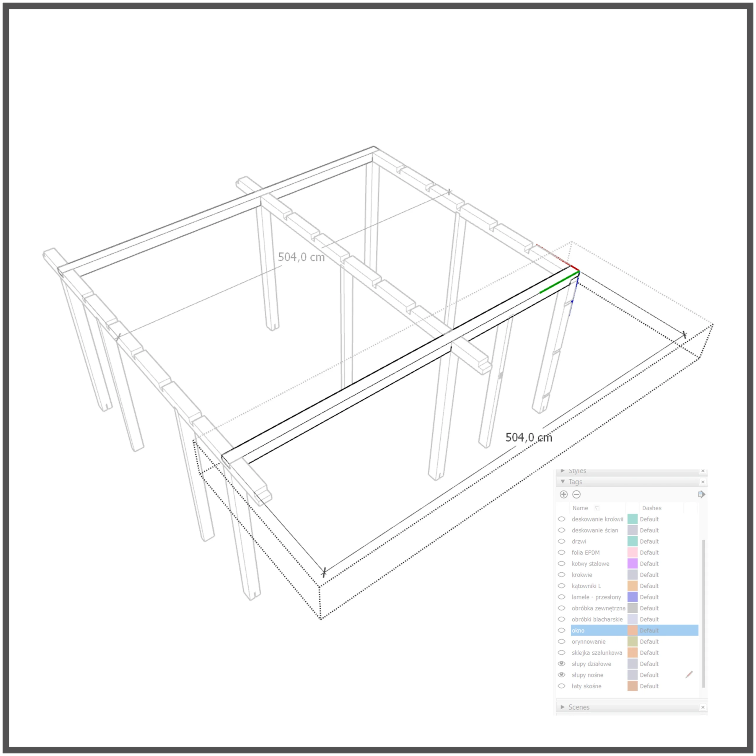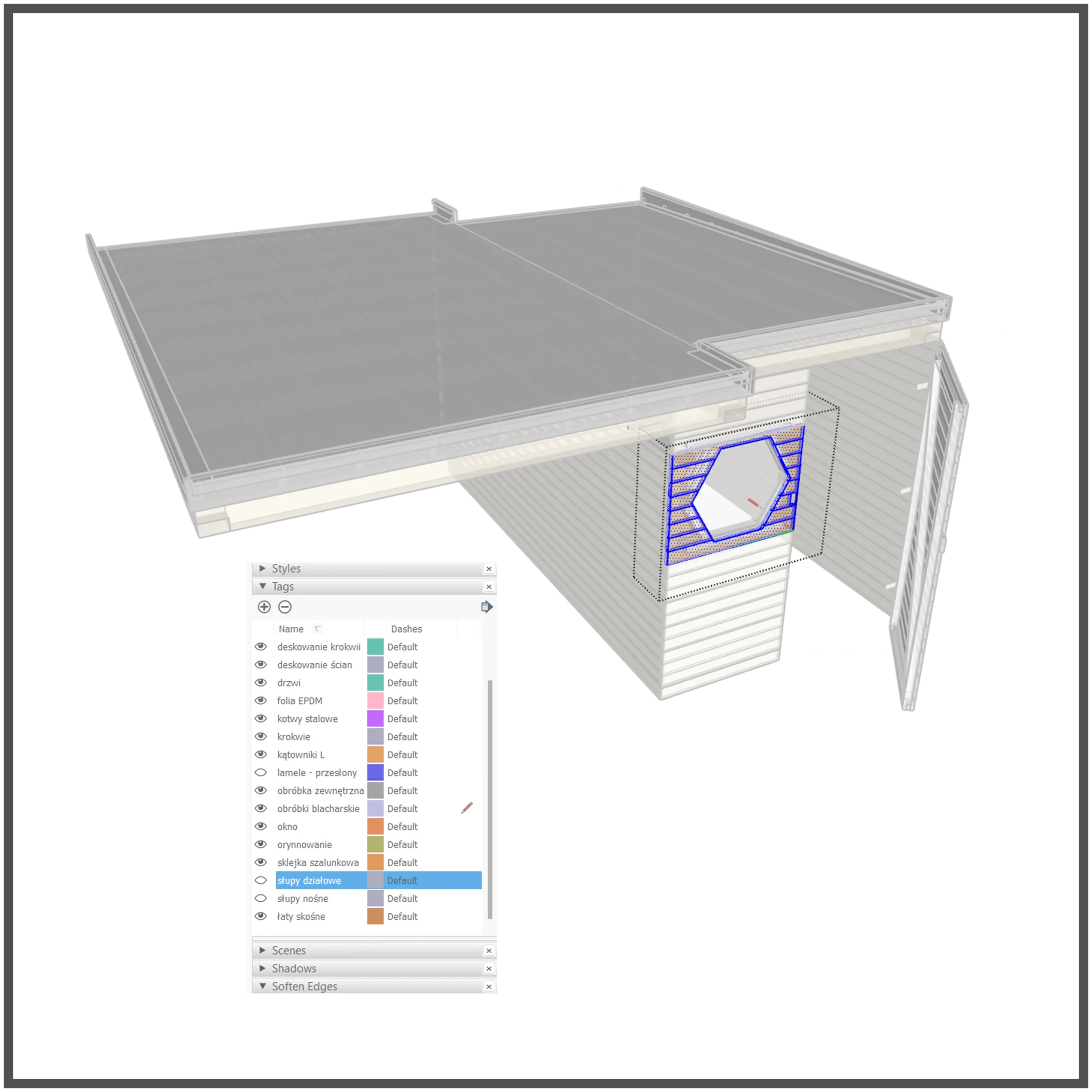 Model zawiera szczegółowe odwzorowanie konstrukcji carportu z domkiem, co pozwala na dokładną analizę każdego elementu. Każdy komponent został przypisany do osobnej warstwy, dlatego zarządzanie widocznością oraz edycją projektu jest wyjątkowo intuicyjne. Co więcej, model został zaprojektowany w skali centymetrowej, co ułatwia integrację z innymi projektami i zapewnia precyzję wymiarowania.