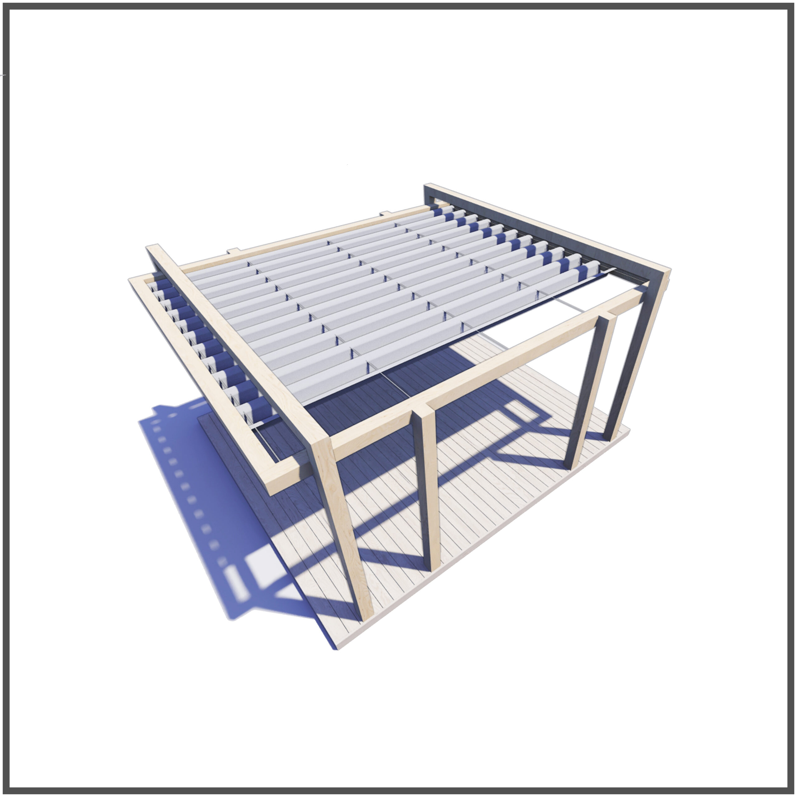 Konstrukcja zadaszenia została zaprojektowana tak, aby była trwała i stabilna, dlatego wykorzystano wysokiej jakości drewno konstrukcyjne typu BSH. Główne elementy, takie jak słupy nośne oraz belki, zostały starannie wymiarowane i zaprojektowane, aby zapewnić optymalną wytrzymałość całej konstrukcji.